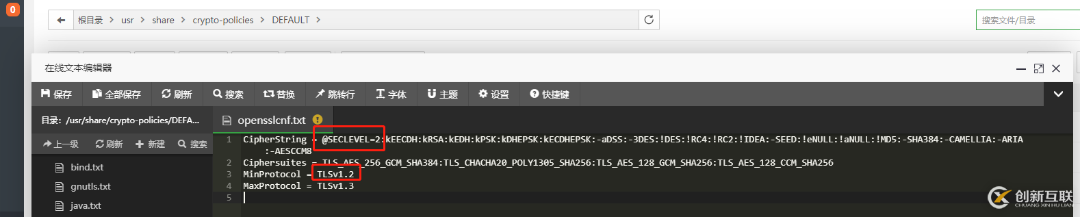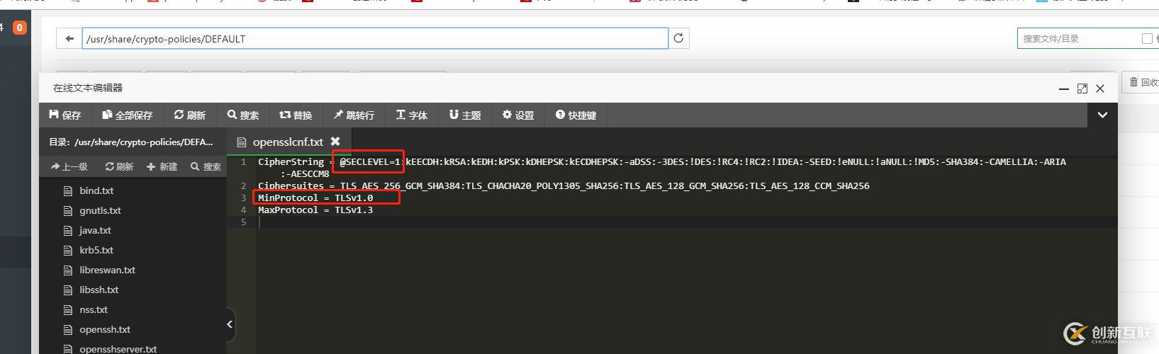 找到 /usr/share/crypto-policies/DEFAULT,修改opensslcnf.txt 配置表,實際上 SQL Server 不支持 TLS 1.2,因此才需要修改