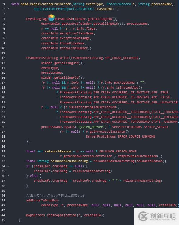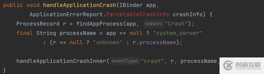 從上面可以看出,若傳入app為null時(shí),processName就設(shè)置為system_server,意思是:如果沒有來源默認(rèn)判定是系統(tǒng)進(jìn)程自己。接著看handleApplicationCrashInner(String eventType......)方法: