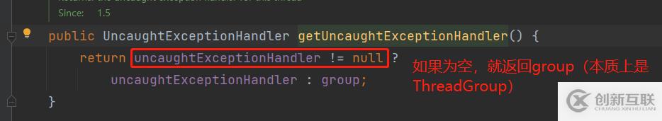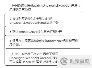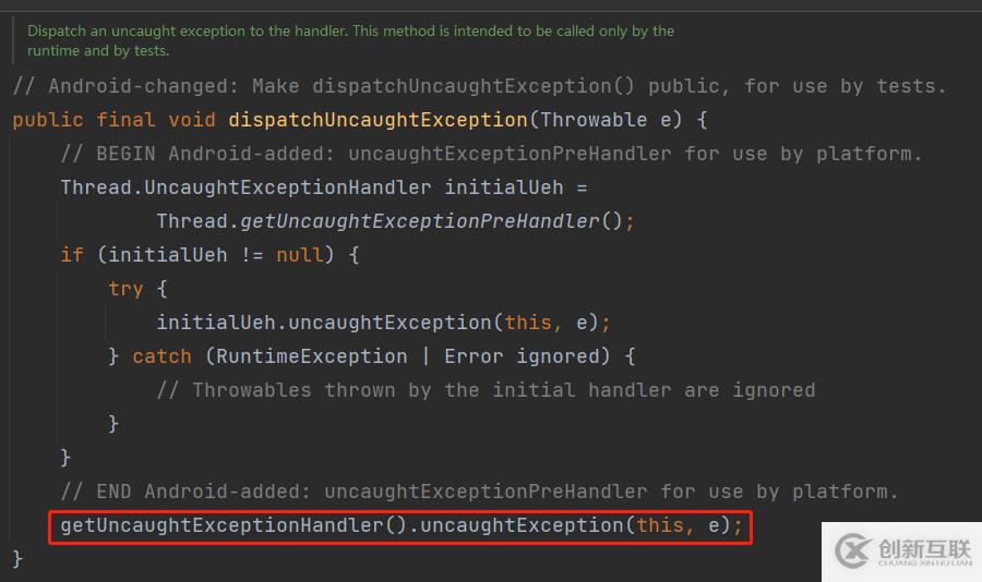 在上圖我們可以看到官方明確告知,JVM在處理未經(jīng)捕獲的異常時(shí),會(huì)調(diào)用當(dāng)前dispatchUncaughtException函數(shù)進(jìn)行處理,這個(gè)里面我們能看到一個(gè)類型為UncaughtExceptionHandler的類。