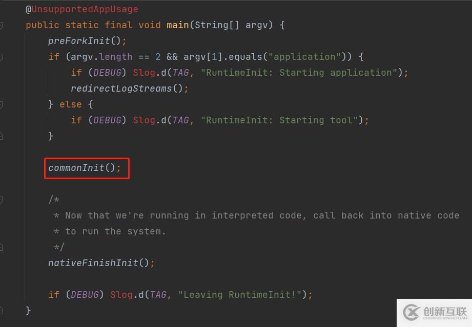 源碼分析步驟6來看下RuntimeInit這個(gè)類,zygote負(fù)責(zé)啟動(dòng)RuntimeInit進(jìn)程(作用:app運(yùn)行時(shí)環(huán)境初始化,用來初始化運(yùn)行時(shí)的一系列信息,其中包含異常處理),它里面有個(gè)main方法: