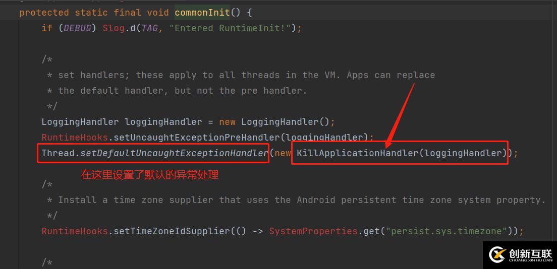看到這里就知道了,默認(rèn)的異常處理(殺進(jìn)程)是在RuntimeInit進(jìn)程(作用:app運(yùn)行時(shí)環(huán)境初始化,用來初始化運(yùn)行時(shí)的一系列信息,其中包含異常處理)的main()方法里設(shè)置的。