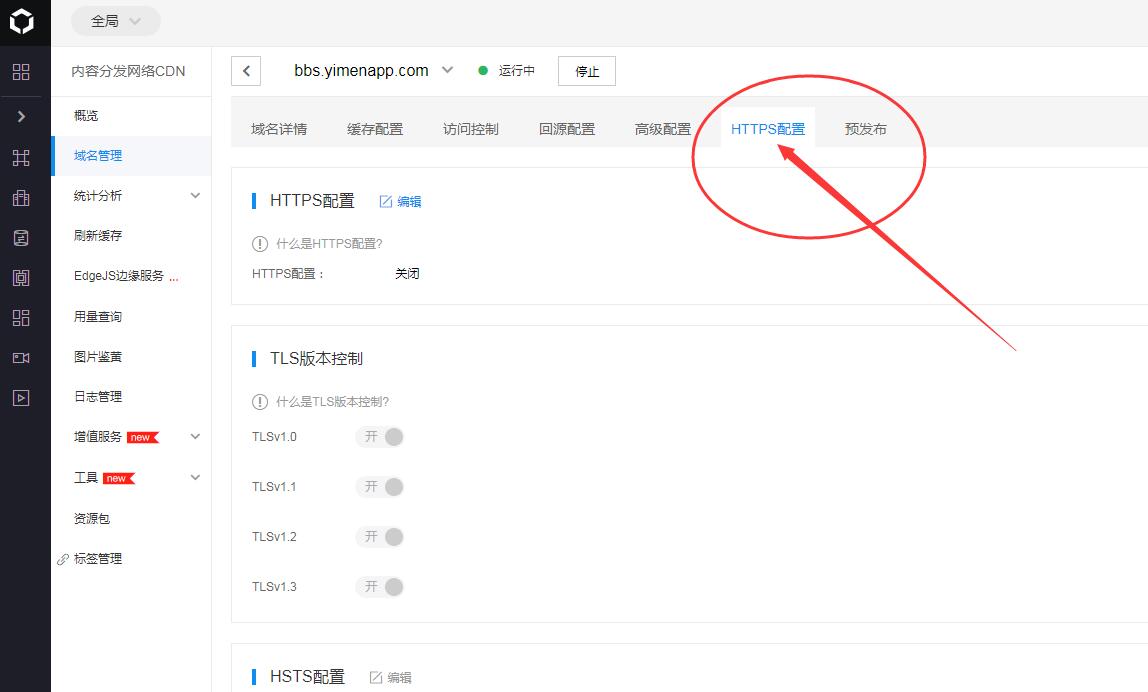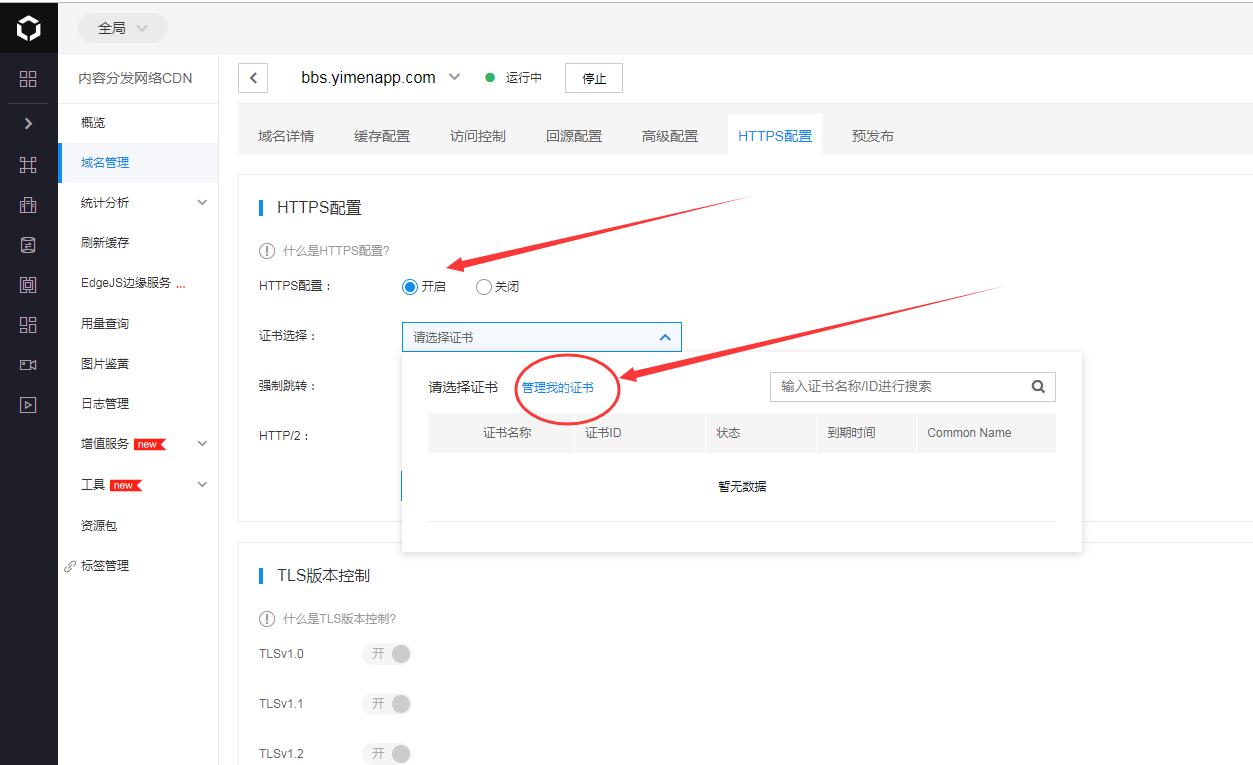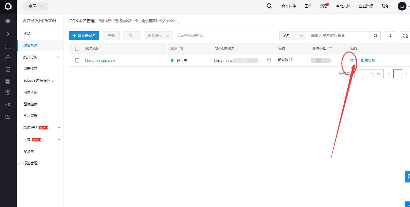 3.在需要配置HTTPS的域名點(diǎn)擊管理編輯