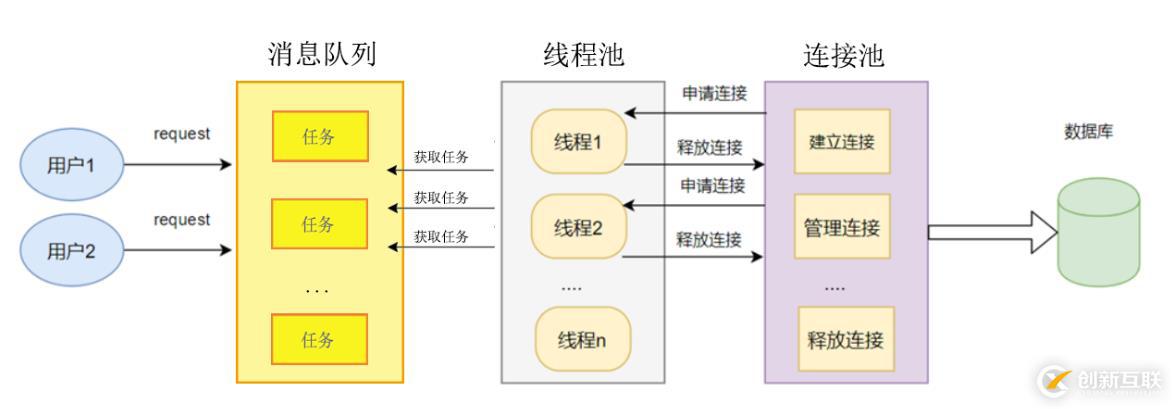 線程池和連接池就可以這么配套,線程池去拿任務,任務說要連數(shù)據(jù)庫,拿到任務的這個工作線程就去數(shù)據(jù)庫池子里拿連接,用完了再把連接還回去,任務干完了,任務就從消息隊列出去,結(jié)束任務的線程回到池子里等著拿后面的任務