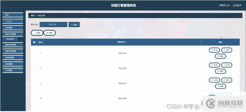 菜品分類管理,管理員可在菜品分類管理頁面進(jìn)行查詢、新增、修改或刪除等操作,如圖5-9所示。
