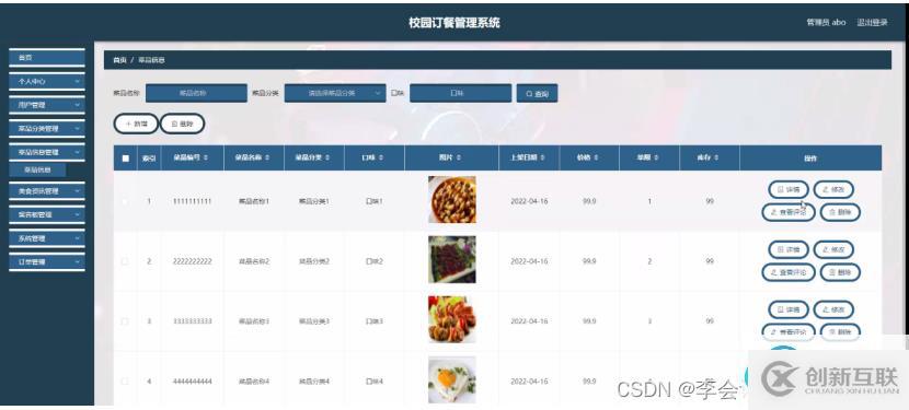 菜品信息管理,管理員可在菜品信息管理頁面查看菜品名稱、菜品編號、菜品分類、口味、圖片、上架日期、價(jià)格、單限、庫存等內(nèi)容,還可進(jìn)行新增、修改、查看評論或刪除等操作,如圖5-10所示。