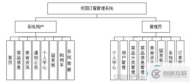 3.1系統(tǒng)功能通過前面的功能分析可以將校園訂餐管理系統(tǒng)的功能分為管理員和用戶兩個(gè)部分,系統(tǒng)的主要功能包括管理員管理:個(gè)人中心、用戶管理、菜品分類管理、菜品信息管理、美食資訊管理、留言板管理、系統(tǒng)管理、訂單管理等內(nèi)容。