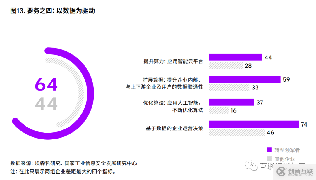 區(qū)別轉(zhuǎn)型領(lǐng)軍者與其他企業(yè)的關(guān)鍵指標(biāo)包括 算力、算據(jù)和算法,即云計算為代表的數(shù)據(jù)計算能 力、數(shù)據(jù)質(zhì)量和連通性所決定的算據(jù)、AI帶動的優(yōu) 化算法,以及基于數(shù)據(jù)的綜合決策。轉(zhuǎn)型領(lǐng)軍者在 這幾個關(guān)鍵指標(biāo)的評估上遙遙領(lǐng)先(圖13)。