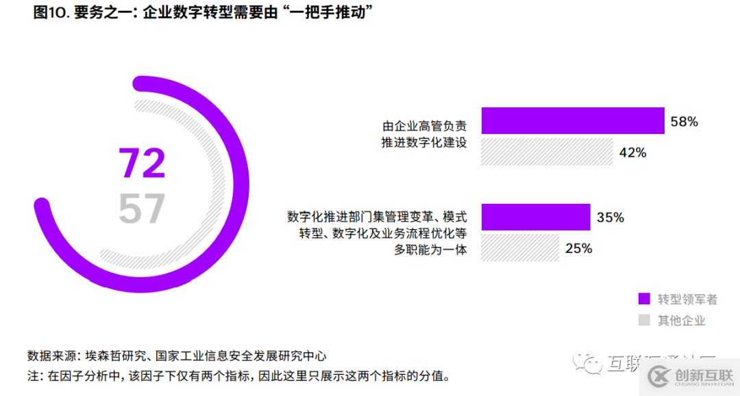 轉(zhuǎn)型領(lǐng)軍者非常重視高層領(lǐng)導(dǎo)在企業(yè)數(shù)字轉(zhuǎn) 型中的作用,58%的被訪領(lǐng)軍者表示其數(shù)字化建 設(shè)由高管負(fù)責(zé),而其他企業(yè)中只有42%做到了這一 點。而被訪領(lǐng)軍者中35%的企業(yè)對數(shù)字化推進(jìn)部 門的定位不是局限于IT部門,而是集管理變革、模 式轉(zhuǎn)型等多職能為一體的綜合性部門,比其他企業(yè) 高出10個百分點(圖10)。
