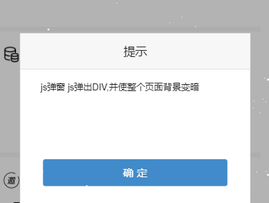 <!-- 遮罩層 --> <div id="cover" > </div> <!-- 彈窗 --> <div id="showdiv" > <!-- 標(biāo)題 --> <div > 提示 </div> <!-- 內(nèi)容 --> <div > js彈窗 js彈出DIV,并使整個(gè)頁(yè)面背景變暗</div> <!-- 按鈕 --> <div onclick="closeWindow()"> 確 定 </div> </div>