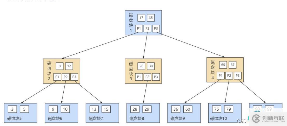 因此,我們可以把結點的度加大(就是節(jié)點的分叉數),把二叉樹變成M叉樹,這樣可以降低樹的深度。如下圖,結點的度變成了3,樹的深度由5 變成了 4.