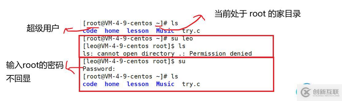 當(dāng)前所處目錄不變? 使用 su [用戶名] 就可以實現(xiàn)當(dāng)前目錄不變,用戶改變。比如下方,一開始的用戶是root,并且處于root 的家目錄,然后使用 su leo 指令,切換為 leo 用戶,可以看出,當(dāng)前所處的目錄名是 root ,這是 root 用戶的目錄,使用 ls 指令,提示無權(quán)限查看。