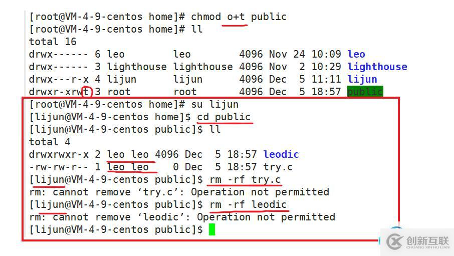 ? 如下,先給public 這個目錄添加粘滯位,然后切換為用戶lijun ,進入 public,試圖刪除用戶leo的目錄和文件夾,發(fā)現(xiàn)不可以。這就是粘滯位。?