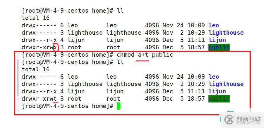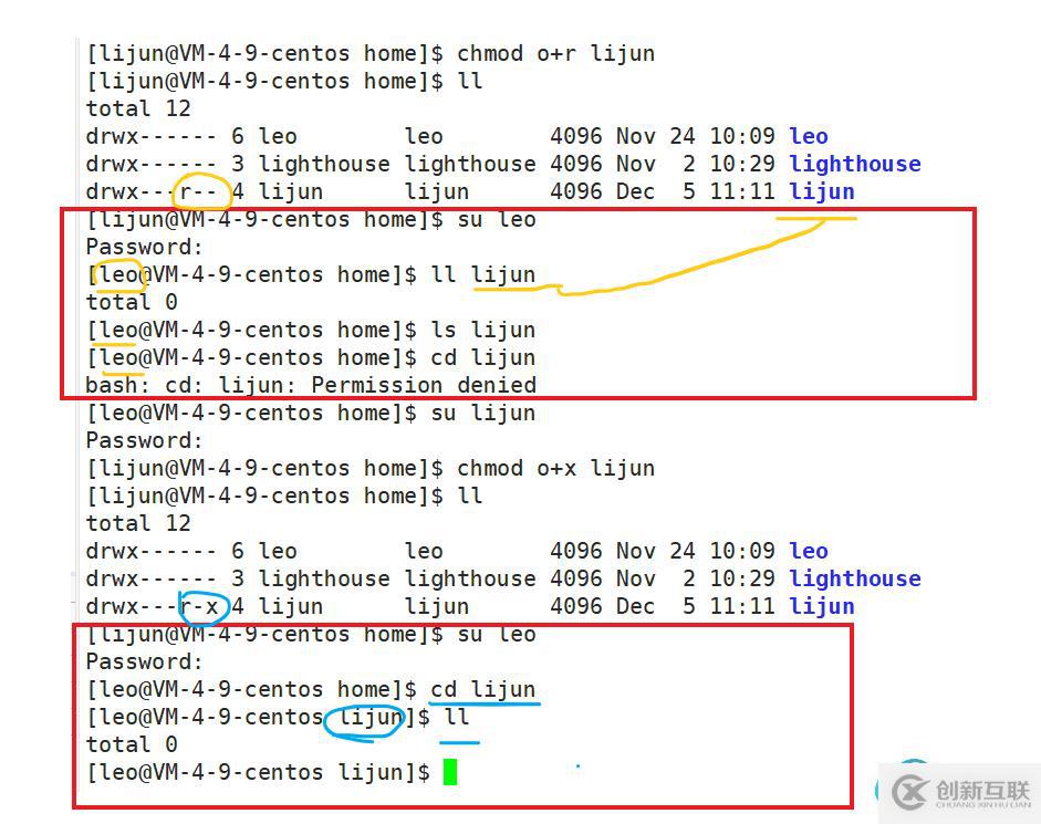 ? 從下面可以看出,一開始對于目錄 lijun,給other加上可讀權(quán)限,切換成用戶 leo,用戶leo對于目錄 lijun 是other,所以只能讀,不能cd 進入目錄 lijun。后來給目錄 lijun 的other加上 可執(zhí)行權(quán)限之后,用戶 leo才可以cd 進入目錄 lijun。