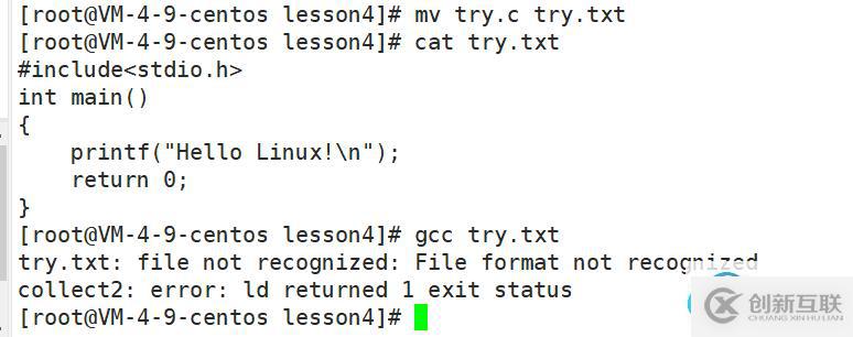 2.雖然文件類型和文件后綴無關(guān),但是,這是對于Linux 系統(tǒng)而言。對于Linux 里面的工具,比如 gcc 等,文件后綴和它有關(guān)。如下,我把try.c 名字改成 try.txt ,但是里面的內(nèi)容不變,依然是一個C 語言的代碼。但是,此時用gcc 編譯,卻發(fā)現(xiàn)不可以。