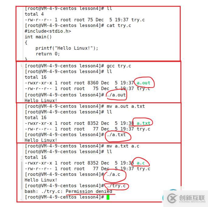 ? 值得注意的是,Linux 環(huán)境下,文件類型和文件后綴無關(guān)。?首先看到 try.c 里面是一個 C 語言的代碼。然后用gcc 編譯 ,得到 a.out 這個可執(zhí)行文件。當(dāng)文件后綴名是 .out ,可以執(zhí)行。后綴換成 .txt ,依然可以執(zhí)行。后綴換成 .c 依然可以執(zhí)行,但是,執(zhí)行 try.c ,卻不可以。充分說明了,文件類型和文件后綴無關(guān)。