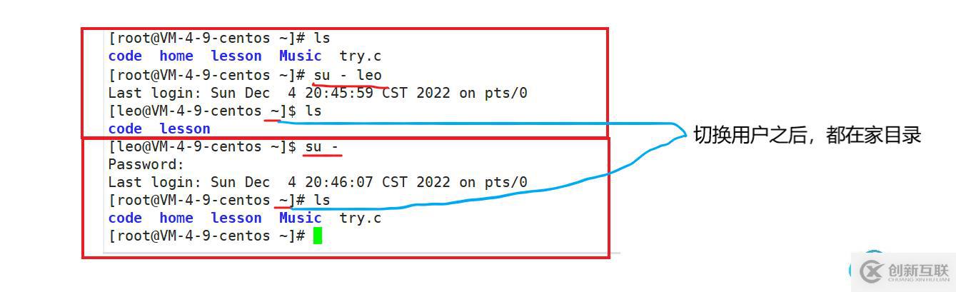 ? 使用 su - [用戶名] 可以實現(xiàn):將目錄改為 更換后的用戶的家目錄 ,并且用戶改變。比如下方,一開始是root 用戶,且所處目錄是root 的家目錄,然后使用 su - leo 切換為leo 用戶,切換之后可以看到,目錄也換為leo用戶的家目錄。
