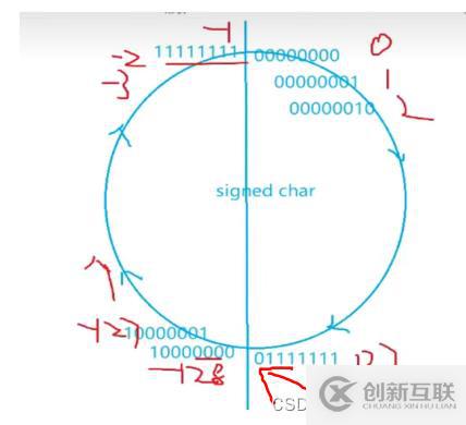小結(jié):對于有符號char類型,其數(shù)據(jù)從0開始到127(01111111)時再加一來到了10000000(-128),再往后-127,-126。。。。-2,-1,? 0?