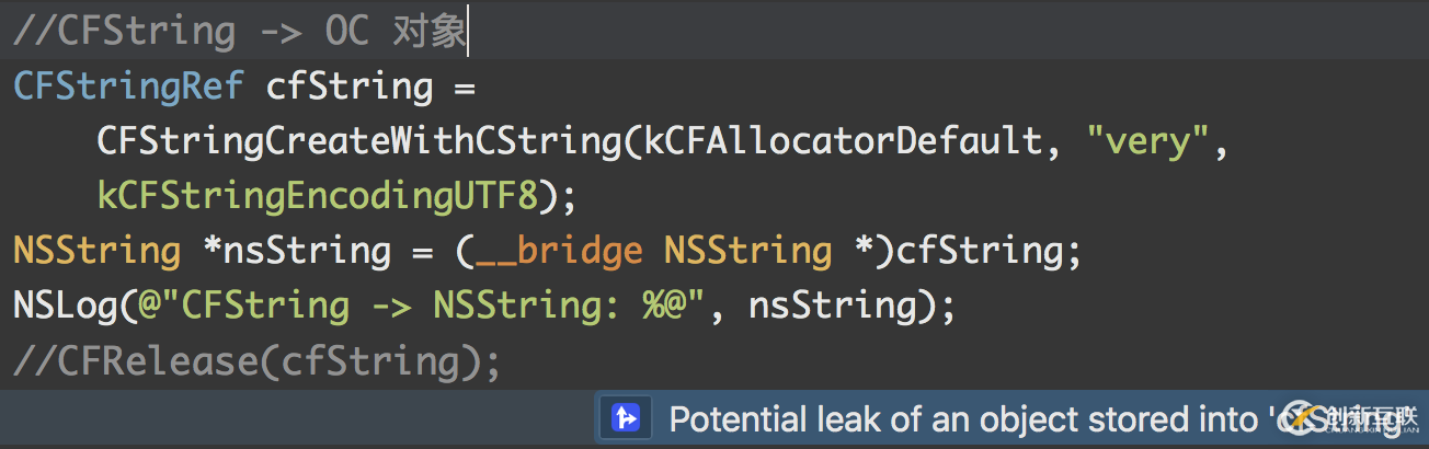 //CFString -> OC 對(duì)象 CFStringRef cfString = CFStringCreateWithCString(kCFAllocatorDefault, "very", kCFStringEncodingUTF8); NSString *nsString = (__bridge NSString *)cfString; NSLog(@"CFString -> NSString: %@", nsString); CFRelease(cfString);