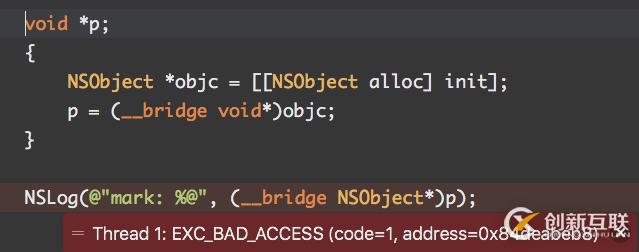 void *p; { NSObject *objc = [[NSObject alloc] init]; //p = (__bridge void*)objc; //p = (__bridge_retained void*)objc; p = (void *)CFBridgingRetain(objc); } NSLog(@"mark: %@", (__bridge NSObject*)p); // 一定要釋放 CFRelease(p);