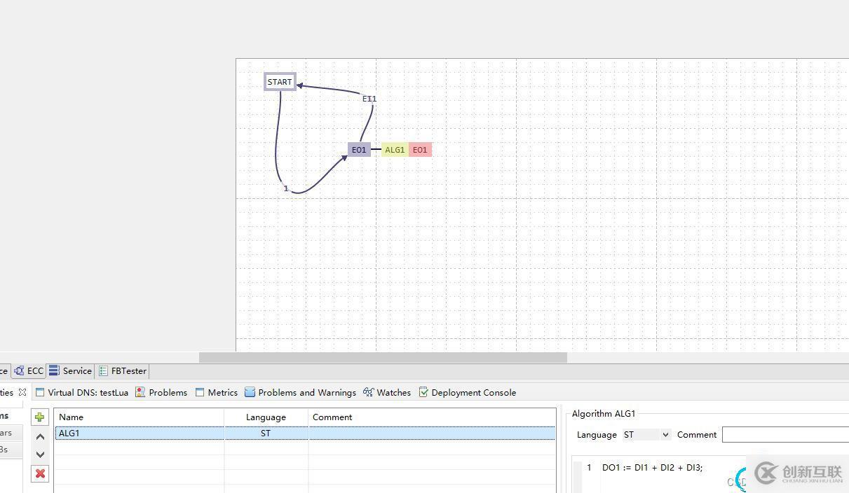 START到EO1的轉(zhuǎn)換條件是觸發(fā)E1事件,狀態(tài)EO1這個(gè)名字可以自己取,到EO1狀態(tài)時(shí)執(zhí)行算法ALG1,ALG1用的是ST語言編寫的,實(shí)現(xiàn)DO1 := DI1 + DI2 + DI3;且觸發(fā)事件EO1。讓后再回到START狀態(tài),1表示始終要回到START狀態(tài)。