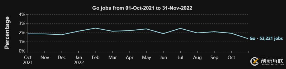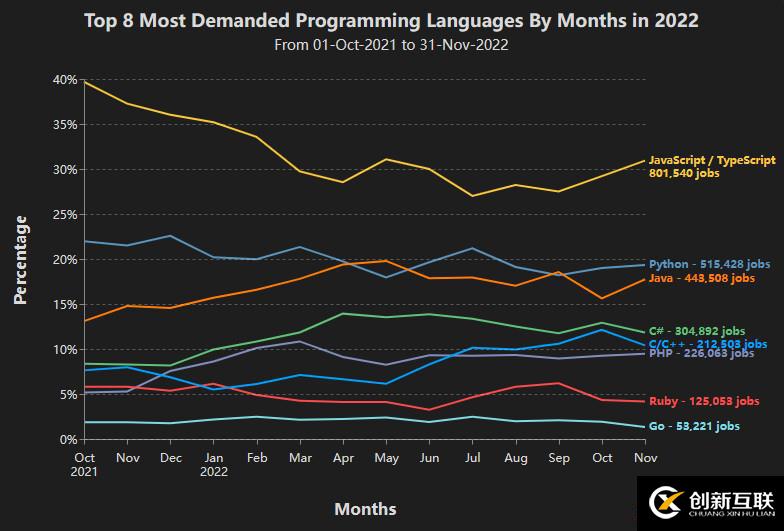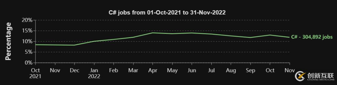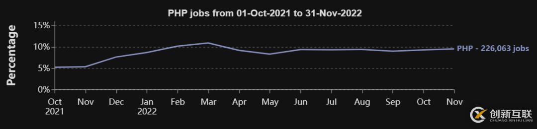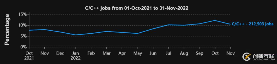 C#、C/C++和PHP也是值得關(guān)注的語言,因為它們有著一致的上升趨勢。例如,在2021年10月PHP的需求還只占總需求的約5%,但到2022年11月占比就已經(jīng)接近10%,幾乎翻了一番。
