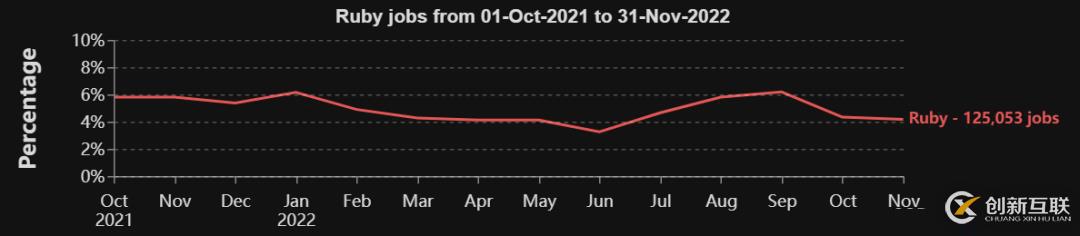 Ruby排名第七,共找到了12.5萬個工作崗位(約占總工作需求的5%)。它最流行的用法是與Web框架Ruby on Rails結(jié)合使用。