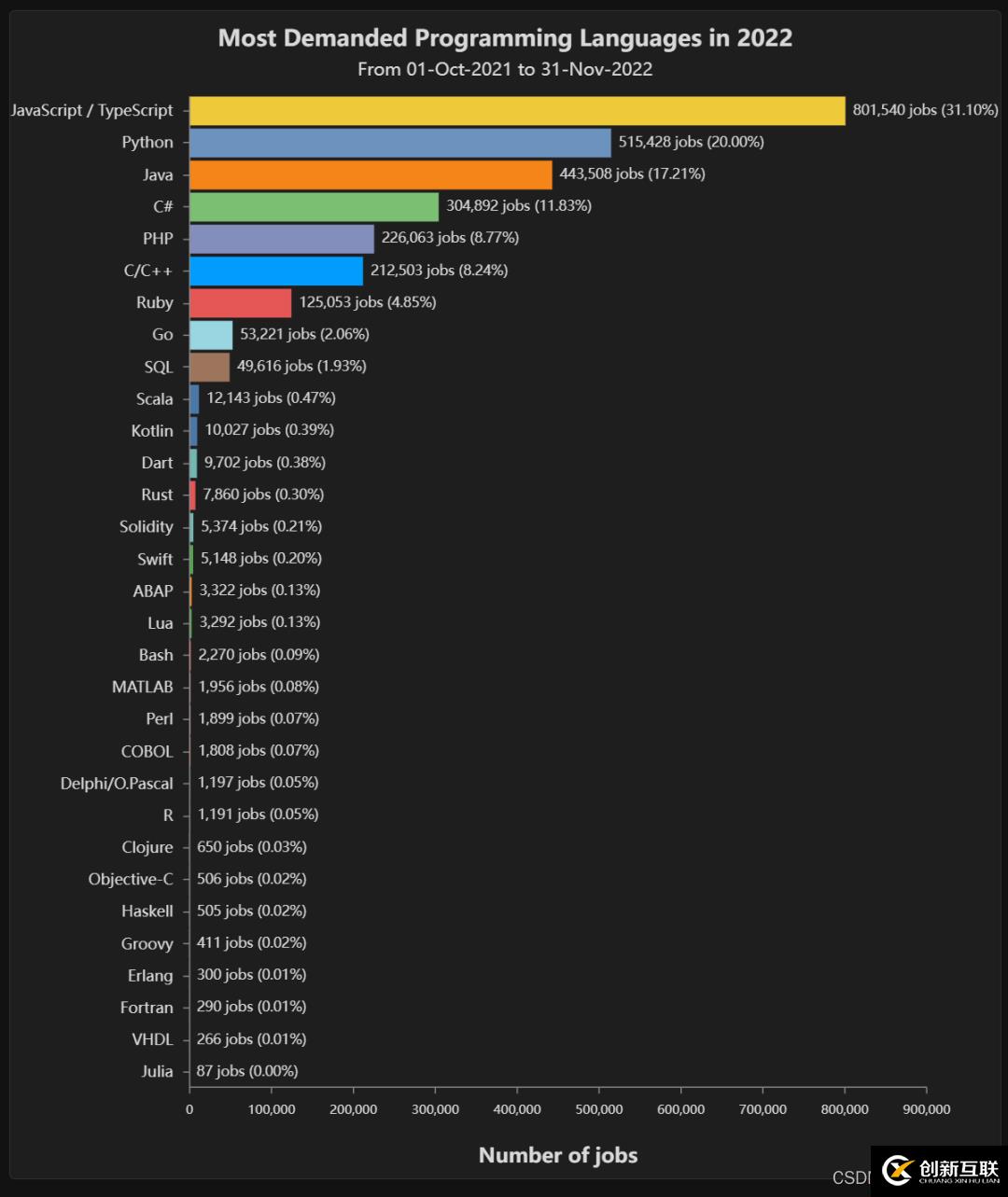以下是2022年編程語言及其各自需求的完整圖表: