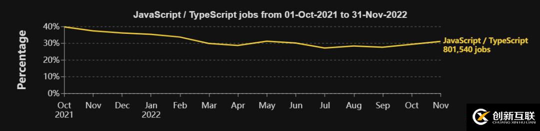 自創(chuàng)建以來,JavaScript 一直是編程熱門語言之一。目前,Javascript 仍然是整個市場上需求量大的編程語言;而 TypeScript 的到來可能也推動了這一里程碑的實(shí)現(xiàn)。TypeScript 的受歡迎程度近年來只增不減,許多新的JavaScript框架完全是用 TypeScript 編寫的,比如Angular或NestJS。從2021年10月到2022年11月(14個月),DevJobsScanner共發(fā)現(xiàn)了801K個工作機(jī)會,明確要求將 JavaScript或TypeScript作為編程語言,約占工作崗位總數(shù)的31%。