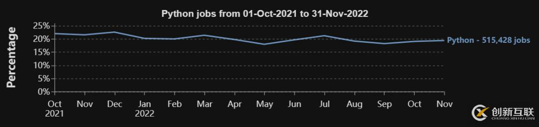 在這14個月中,有51.5萬份工作崗位明確要求將Python作為編程語言,占工作崗位總數(shù)的20%。