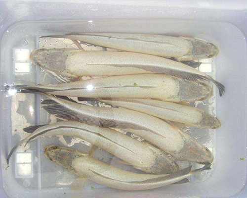 特征 白甲烏鱧體色白,身體呈棒形,頭部扁平,頭部鱗片較大,尾部鱗片細(xì),背鰭條47,臀鰭條38,側(cè)線鱗63,鰓耙數(shù)13,脊椎骨55,體長(zhǎng)為體高的7.8~8.2倍。? |