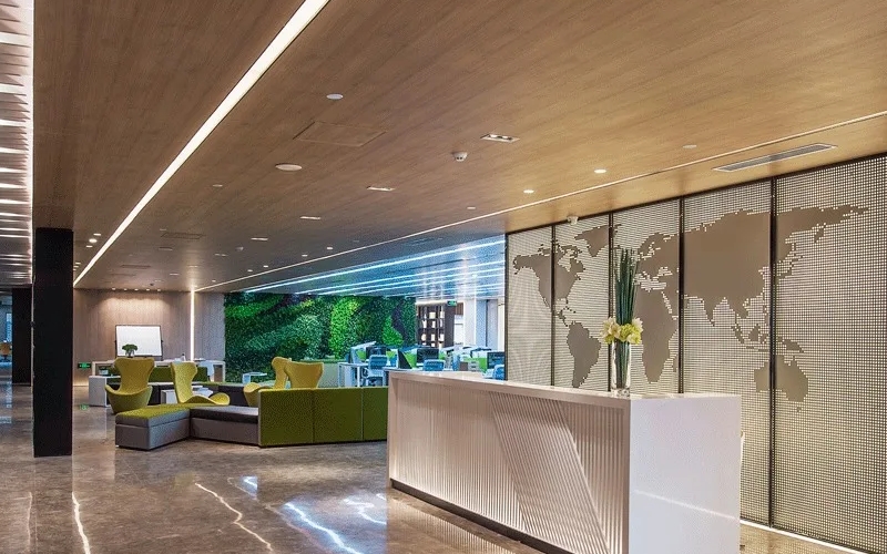 設(shè)計師以一圈環(huán)繞的燈帶強調(diào)空間入口處,讓進出辦公室的日常動作,變得更有儀式感和場景感。光在清透的空間中,靈動優(yōu)雅,營造出清凈而光明的空間氛圍。純白色的前臺,線條隔柵的設(shè)計結(jié)合局部燈光效果,簡約而富有層次美感,相近色系的世界地圖背景,呼應(yīng)得當(dāng),又起到屏風(fēng)的隔景效果。