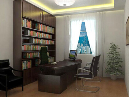 小型辦公室裝修實景圖:辦公桌后面的大書柜在收納的同時也形成一道靚麗的風景線,仿佛在暗示客人:辦公室主人可是個愛讀書的博學之士喲!