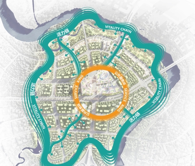 總體而言,該項(xiàng)目的規(guī)劃采用中心環(huán)、外帶和各種通道的結(jié)構(gòu)。該中心與地鐵線路相連,形成TOD商業(yè)核心區(qū),圍繞該核心區(qū)旋轉(zhuǎn)一個(gè)功能環(huán),抵消高速道路造成的碎片化,承載零售中心以及各種公共社區(qū)服務(wù)功能。一組主題路徑將內(nèi)部區(qū)域與包含公共商業(yè)和娛樂(lè)空間的外部綠化帶連接起來(lái),在自然和城市景觀之間開辟了一條通道。