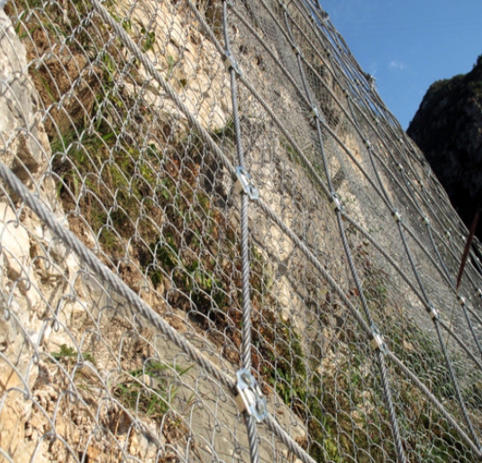 GPS2型主動(dòng)防護(hù)網(wǎng)主要由鋼絲繩網(wǎng),普通鋼絲網(wǎng)(通常稱(chēng)為鐵絲網(wǎng))和TECCO?高強(qiáng)度鋼絲網(wǎng)組成。將防護(hù)網(wǎng)覆蓋在斜坡的潛在地質(zhì)災(zāi)害上,從而達(dá)到其保護(hù)目的。
