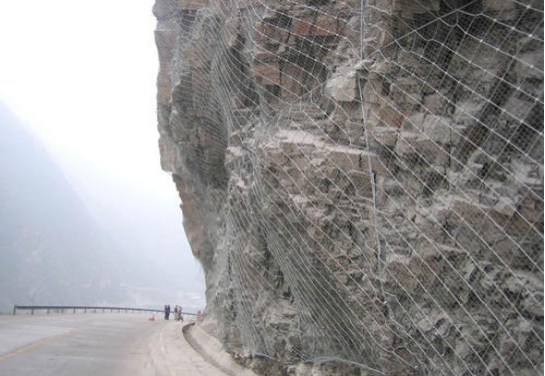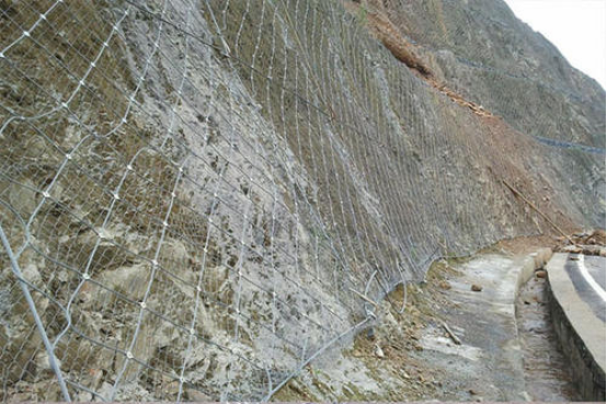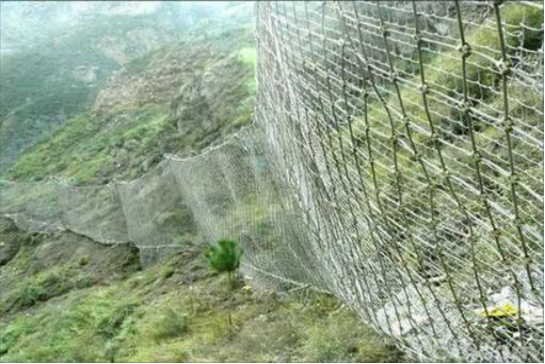 柔性防護(hù)網(wǎng)系統(tǒng)是一種圍欄式柔性石網(wǎng),其設(shè)置在斜坡上的相應(yīng)位置,用于阻擋和攔截斜坡上的滾動石,以免損壞被保護(hù)物。柔性防護(hù)網(wǎng)主要由鋼絲網(wǎng)組成,柔性防護(hù)網(wǎng)覆蓋并包裹在所需的防護(hù)坡度或巖石上,以限制坡度上的巖石表面風(fēng)化或巖石的破壞和塌陷,或者在一定范圍內(nèi)控制落石運(yùn)動,柔性防護(hù)網(wǎng)充分發(fā)揮整個柔性防護(hù)網(wǎng)系統(tǒng)的防護(hù)能力,使柔性防護(hù)網(wǎng)系統(tǒng)能夠承受更大的負(fù)荷,并降低單個螺栓對錨固力的要求。
