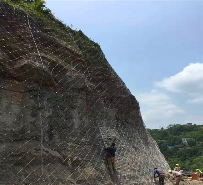 主動(dòng)防護(hù)網(wǎng)(包括GAR2、GPS2、GER2和GTC-65A),常用于坡面崩塌、風(fēng)化剝落、溜坍、溜滑或塌落類地質(zhì)災(zāi)害的加固防護(hù),其明顯特征是采用系統(tǒng)錨桿固定,并根據(jù)柔性網(wǎng)的不同,分別通過(guò)支撐繩和縫合張拉(鋼絲繩網(wǎng)或鐵絲格柵)或預(yù)應(yīng)力錨桿(TECCO-65格柵)來(lái)對(duì)柔性網(wǎng)部分實(shí)現(xiàn)預(yù)張拉,從而對(duì)整個(gè)邊坡形成連續(xù)支撐,其預(yù)張拉作業(yè)使系統(tǒng)盡可能緊貼坡面,并形成了抑制局部巖土體移動(dòng)或在發(fā)生局部位移或破壞后將其裹縛(滯留)于原位附近的預(yù)應(yīng)力,從而實(shí)現(xiàn)其主動(dòng)防護(hù)(加固)功能。該系統(tǒng)在施工工藝上為確保其盡可能緊貼坡面,錨桿孔口應(yīng)開鑿孔口凹坑(系統(tǒng)布置的靈活性常可利用天然低凹位置設(shè)置錨桿)。