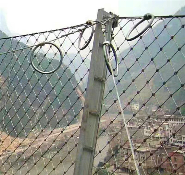被迫防護(hù)網(wǎng)是由鋼絲繩網(wǎng)、環(huán)形網(wǎng)、固定體系、減壓環(huán)和鋼柱四個主要部分構(gòu)成。鋼柱和鋼絲繩網(wǎng)銜接組合構(gòu)成一個全體,對所防護(hù)的區(qū)域構(gòu)成面防護(hù),然后阻撓崩塌巖石土體的下墜,起到邊坡防護(hù)效果。