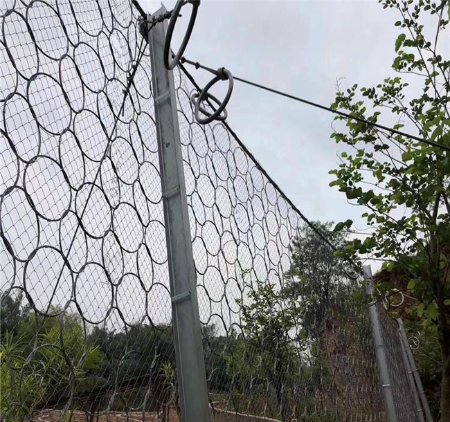 材質(zhì):鋼絲繩網(wǎng)、支撐繩和減壓環(huán)構造:由鋼絲繩網(wǎng)或環(huán)形網(wǎng)(需攔截小塊落石時附加一層鐵絲格柵)、固定系統(tǒng)(錨桿、攔錨繩、基座和支撐繩)、減壓環(huán)和鋼柱四個主要部分構成。
