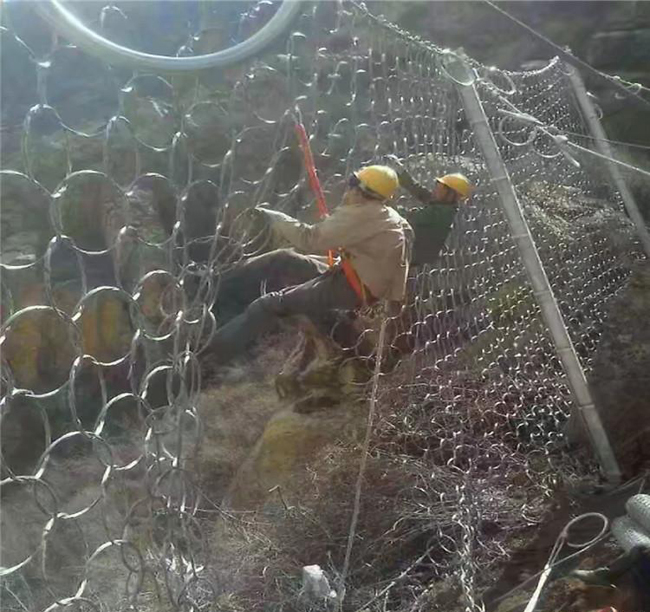 為主的式柔性攔石網(wǎng),一般裝置在斜坡方位,用于阻攔斜面坡上的滾落石以防止其損壞維護(hù)的目標(biāo),因而有時(shí)也稱(chēng)為攔石網(wǎng);當(dāng)設(shè)置于泥石流區(qū)內(nèi)時(shí),便可構(gòu)成阻攔泥石流體內(nèi)固體大顆粒的柔性格柵壩。具有高柔性,高防護(hù)強(qiáng)度,易鋪展性