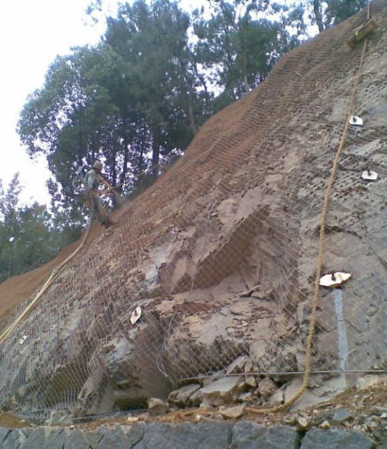 防護網(wǎng)是采用鋼絲繩錨桿或鋼筋錨桿及支撐繩對可能發(fā)生災(zāi)害的邊坡進行覆蓋,以實現(xiàn)邊坡加固或限制落石的移動范圍。