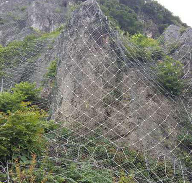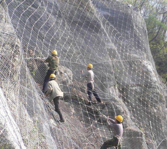 SNS主動(dòng)邊坡防護(hù)網(wǎng)是在錨桿和支護(hù)繩施加于各網(wǎng)塊后,對(duì)邊坡上的危險(xiǎn)落石施加一定的預(yù)緊壓力,以提高巖石的穩(wěn)定性,防止危險(xiǎn)的巖石掉落。該系統(tǒng)主要由柔性鋼絲繩錨桿、支撐索和鋼絲繩網(wǎng)組成。將鋼絲繩網(wǎng)鋪設(shè)在搭建好的網(wǎng)架上。一般是5米×45米正方形標(biāo)準(zhǔn)模式(為了節(jié)省材料,也可以是4.5米×25米),每個(gè)鋼絲繩網(wǎng)和周圍的支撐索被縫合并與周圍的支撐索連接,并進(jìn)行第二預(yù)張力。預(yù)張過程可以使防護(hù)系統(tǒng)對(duì)邊坡施加一定的正常預(yù)緊壓。以提高表層土的穩(wěn)定性,控制危險(xiǎn)巖體的運(yùn)動(dòng)。在每個(gè)獨(dú)立的保護(hù)區(qū)域,系統(tǒng)的每個(gè)組成部分都是一個(gè)相互關(guān)聯(lián)的整體。一旦邊坡發(fā)生局部變形或位移,就需要調(diào)整系統(tǒng),這是因?yàn)橄到y(tǒng)不是局部的而是以整體的形式發(fā)揮作用的。