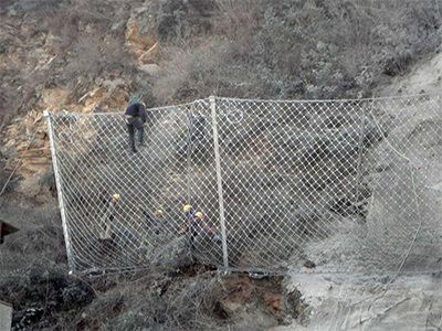 邊坡防護(hù)網(wǎng)防護(hù)系統(tǒng)分為主動(dòng)防護(hù)系統(tǒng)和被動(dòng)防護(hù)系統(tǒng),主動(dòng)防護(hù)系統(tǒng)是將鋼絲繩網(wǎng)為主的各類柔性網(wǎng),覆蓋包裹在所需防護(hù)斜坡或巖石上。以限制坡面巖石土體的風(fēng)化剝落或破壞,對(duì)巖石和坡面起到了加固作用。同時(shí)也可控制落石在一定范圍內(nèi)運(yùn)動(dòng),起到了圍護(hù)作用。被動(dòng)防護(hù)系統(tǒng)是由鋼絲繩網(wǎng)、環(huán)形網(wǎng)、(需攔截小塊落石時(shí)附加一層鐵絲格柵)、固定系統(tǒng)(錨桿、拉錨繩、基座和支撐繩)減壓環(huán)和鋼柱四個(gè)主要部分構(gòu)成,鋼柱和鋼絲繩網(wǎng)連接組合構(gòu)成一個(gè)整體,對(duì)所防護(hù)的區(qū)域形成面防護(hù)。從而阻止崩塌巖石土體的下墜,起到邊坡防護(hù)作用。