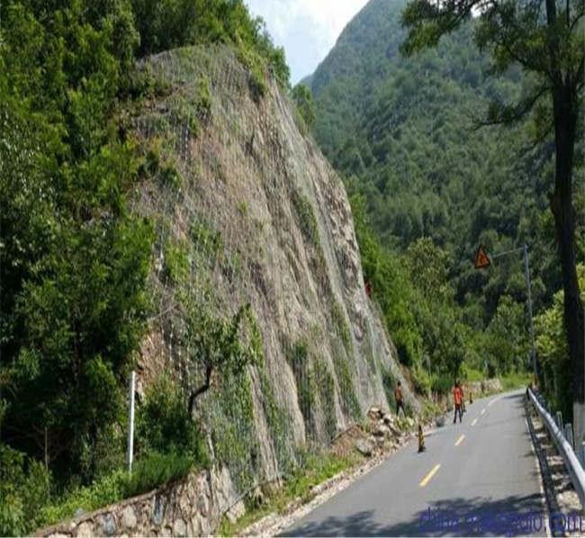 公路山體護(hù)坡攔石網(wǎng)作用原理上類似于噴錨和土釘墻等面層護(hù)坡體系,但因其柔性特征能使系統(tǒng)將局部集中荷載向四周均材質(zhì):鋼絲繩網(wǎng)、普通鋼絲格柵(常稱鐵絲格柵)和TECCO高強(qiáng)度鋼絲格柵 勻傳遞以充分發(fā)揮整個(gè)系統(tǒng)的防護(hù)能力,即局部受載,整體作用,從而使系統(tǒng)能承受較大的荷載并降低單根錨桿的錨固力要求 。
