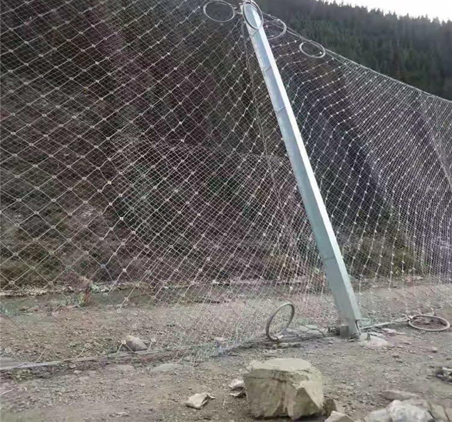 用數(shù)股鋼絲盤結(jié)成環(huán)形相互套接而形成的網(wǎng)。其作用是攔截落石防護(hù)能量一般為150kj--2000kj