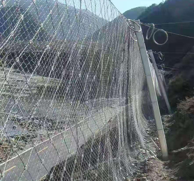 構(gòu)造:由鋼絲繩網(wǎng)或環(huán)形網(wǎng)(需攔截小塊落石時(shí)附加一層鐵絲格柵)、固定系統(tǒng)(錨桿、攔錨繩、基座和支撐繩)、減壓環(huán)和鋼柱四個(gè)主要部分構(gòu)成