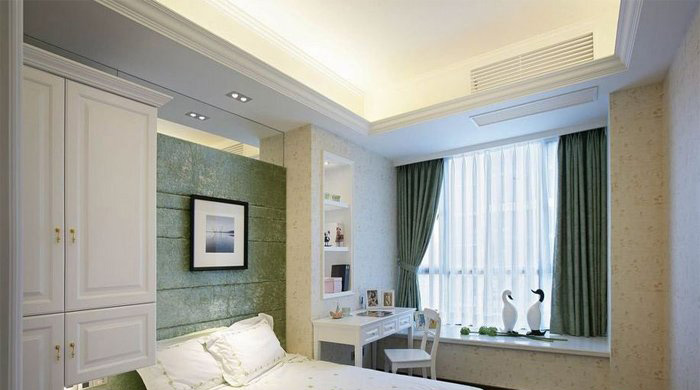 適合臥室小但有大飄窗的家庭。窗簾裝在飄窗里顯得臥室寬敞;里面頂裝,不占空間,還美觀。但如果你家里的飄窗面積小,做了則會(huì)感覺飄窗視覺效果太擁擠。