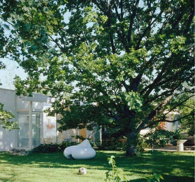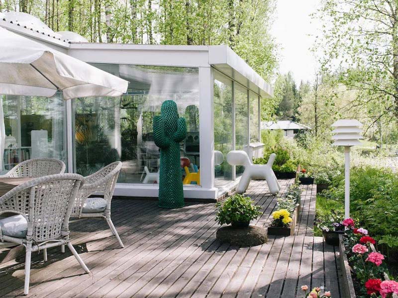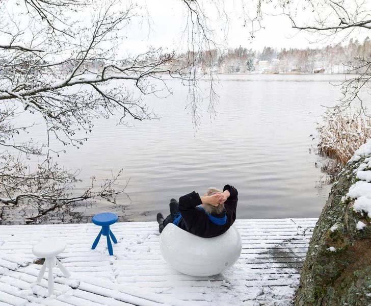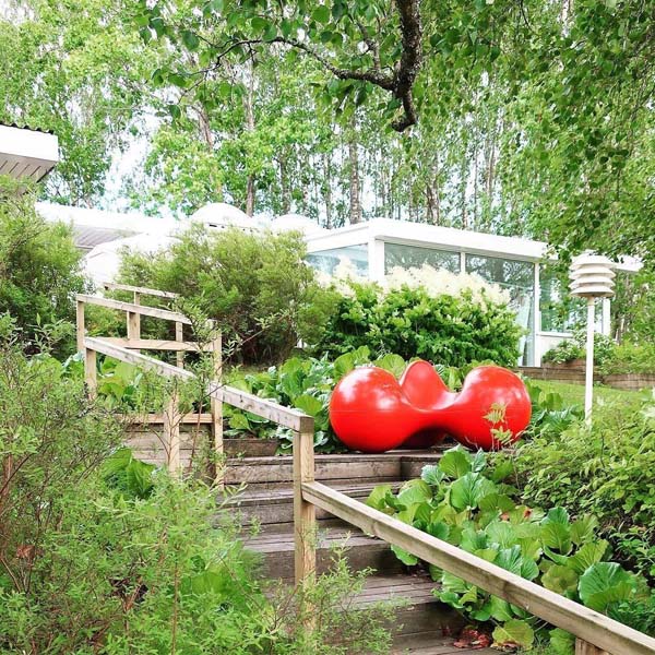 因?yàn)橄矚g自然中的流水,因此Eero Aarnio把家安在了芬蘭首都附近一個(gè)名叫Veikkola的小鎮(zhèn)上。簡(jiǎn)約的座椅在綠陰下清晰且顯眼,夏天的味道油然而生。