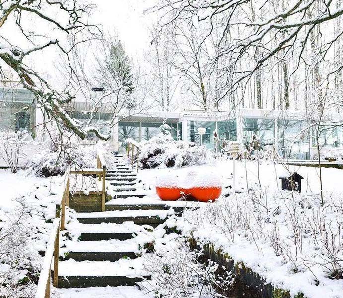 同眾多現(xiàn)代主義住宅一樣,Eero Aarnio設(shè)計(jì)的房子擁有一個(gè)簡(jiǎn)潔的外形,光潔的白色墻面和大面積玻璃窗構(gòu)建出通透明亮的居住空間。每當(dāng)冬天來(lái)臨,玻璃房在皚皚白雪覆蓋下,像是與周圍環(huán)境融為一體。