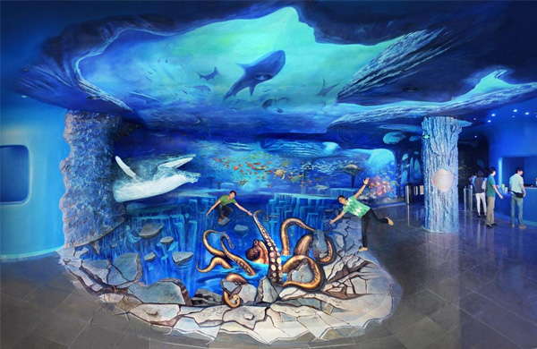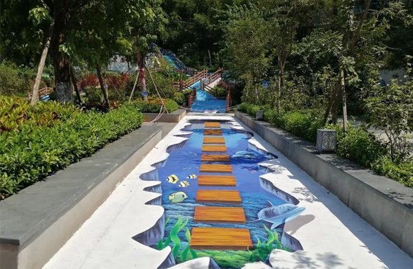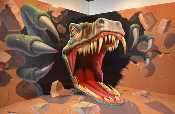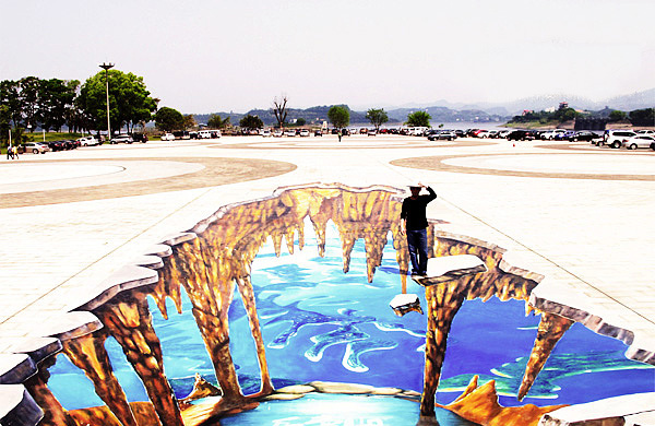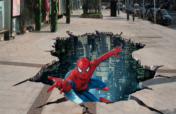 3D街頭涂鴉,則將"藝術(shù)效果特殊化"的理念進(jìn)一步發(fā)揚(yáng)光大,它以室外地面為媒介,利用平面透視的原理,制造出視覺上的虛擬立體效果,令參觀者有一種身臨其境的感覺。3D街頭地畫中的景物立體、細(xì)膩、逼真,往往能達(dá)到以假亂真的藝術(shù)效果。