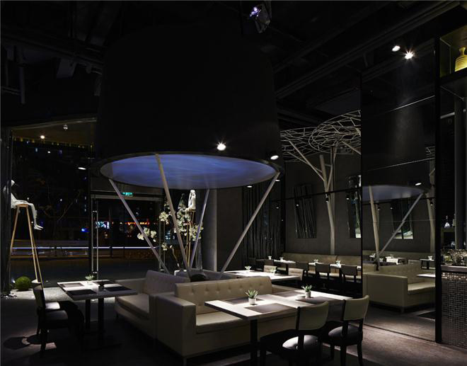 商業(yè)空間設(shè)計中采用一些喜劇化的設(shè)計亮點,巨大的臺燈,燈布下游動的的水母,水母下談著小情,說著小事,品嘗著美食的男男女女。